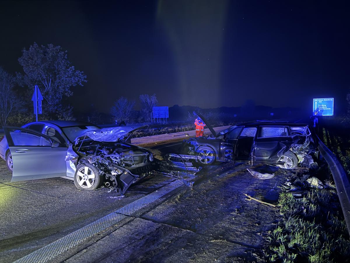 Beim Eintreffen der ersten Einsatzkräfte bestätigte sich die gemeldete Situation. Zwei Fahrzeuge waren miteinander kollidiert, die Fahrbahn war mit Trümmerteilen übersät. Der Rettungswagen aus Sandkrug war bereits vor Ort und versorgte die beiden verletzten Personen. Die Feuerwehr Wardenburg übernahm zunächst die Absicherung der Einsatzstelle, stellte den Brandschutz sicher und leuchtete die Unfallstelle für die Polizei und den Rettungsdienst aus.